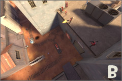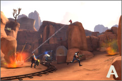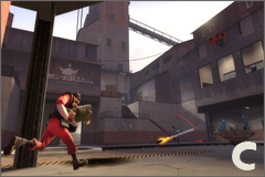 Badwater Basin is a Payload map focusing on more open spaces and less chokepoints than Gold Rush. (A) Right out of the gate is a multi-level area where the Blu team needs to control the high ground while moving the cart through a tunnel below. This open area has few natural choke points, allowing Scouts, Soldiers, and Demomen to move creatively through the space, forcing the Red team to rapidly respond to choices made by Blu. (B) As the track winds its way into tighter spaces, vertical control becomes more important. Each successive checkpoint requires the Blu team to take control of defensive positions above the track, usually occupied by Red Engineers. (C) Eventually the track winds down into a large basin which the Blu team must assault from all sides in a final push to destroy the Red base.
