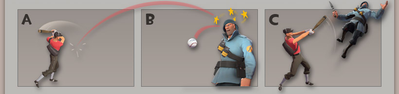 You Scouts are gonna love this highly collectible bat that smacks baseballs at the other team, stunning the living crap outta anybody dumb, slow, drunk, mute or Australian enough to get in the way. The farther the ball flies before ricocheting offa some chucklehead's skull, the longer he's gonna be stunned. And guys who think they're tough because they're invulnerable? It works on them too. Now the bad news: You can't double jump when you're carrying this little beauty. On the other hand, double jumping never put anybody in a coma.